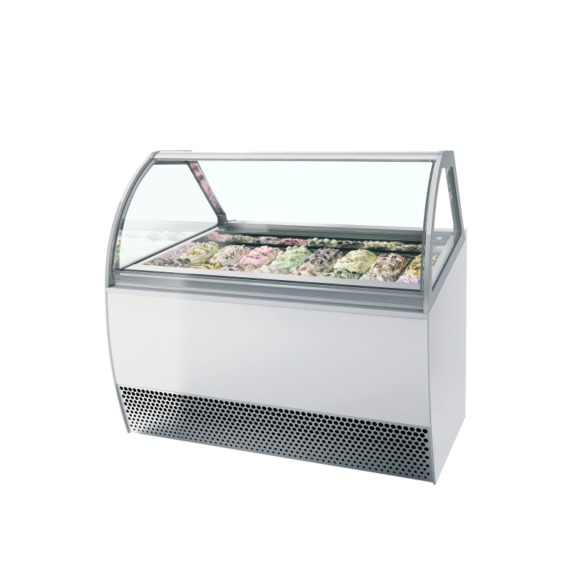 La gamme Millennium LX de coffres pour glace en bac est disponible en version 12 ou 24 bacs Napoli. Cette vitrine élégante à la façade incurvée peut ainsi présenter une grande variété de parfums de glace. Le système très efficace de froid ventilé permet le refroidissement homogène de vos glaces et gelati; pour une température de service idéale. Le verre est chauffé pour éviter la condensation; et la vitrine est équipée d’un store.